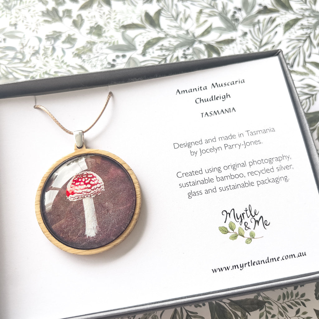 • This pendant/necklace is handmade in Tasmania from sustainably sourced bamboo, recycled silver and glass.